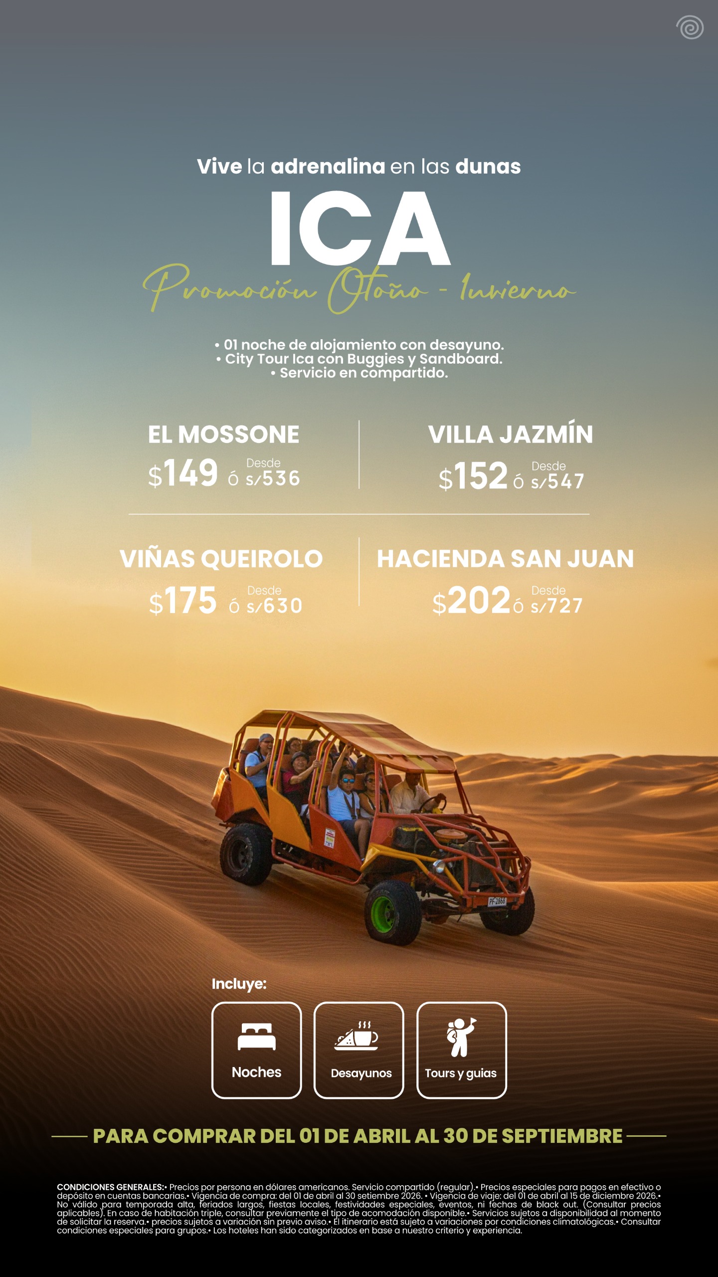 | Experiencia – Cena En El Desierto De Huacachina | $ 332.00 | ver programa |
