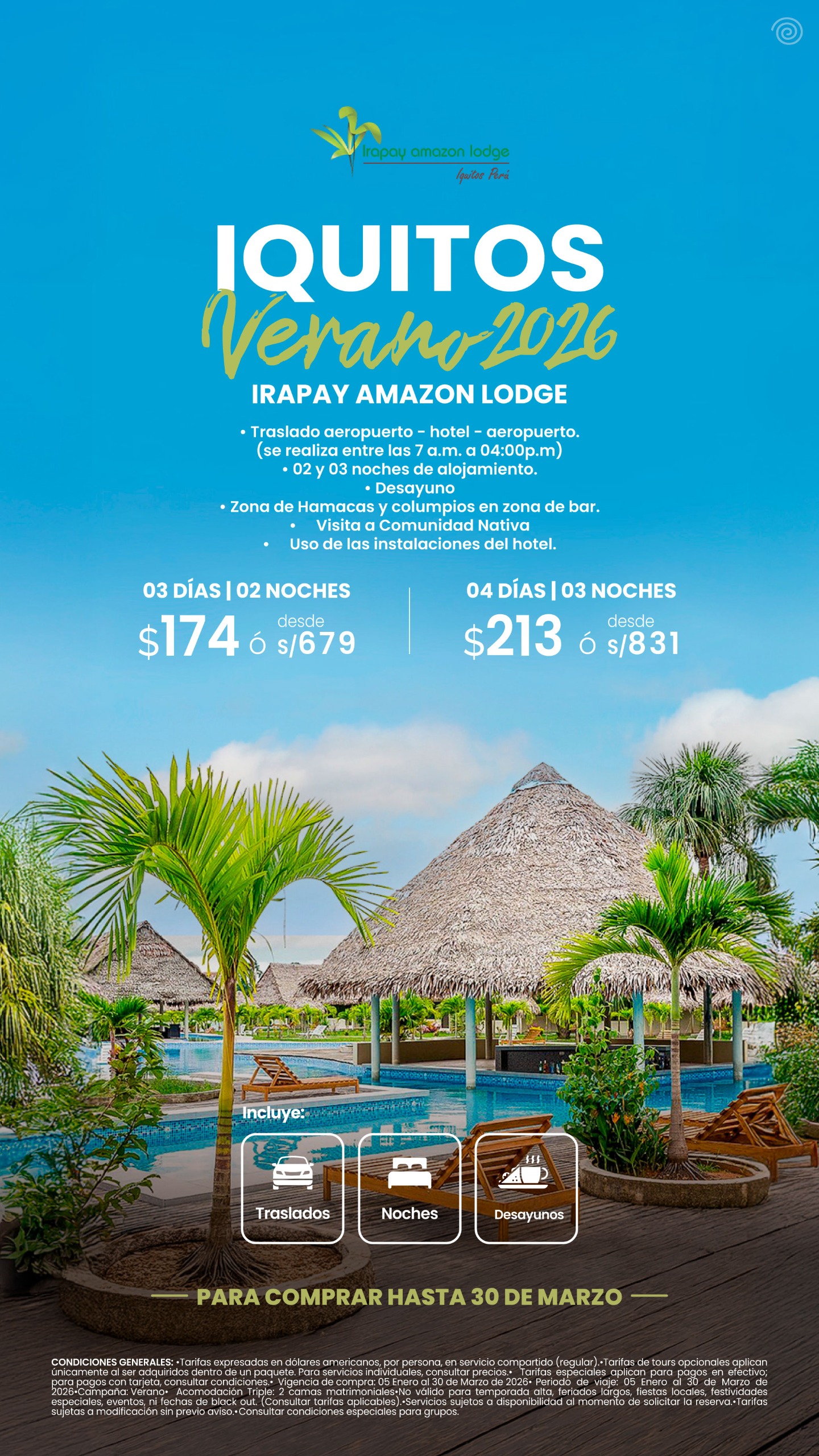| Iquitos Selva – Irapay Amazon Lodge (03 días / 02 noches) | $ 174.00 | ver programa |